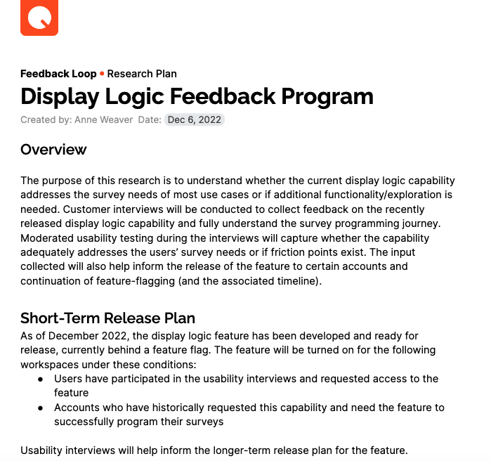 Understand if the new display logic feature met users' needs and identify areas needing improvement. Additionally, we wanted to investigate the process of survey programming and the role of logic while also evaluating user understanding of skip and display logic terms and their significance.
